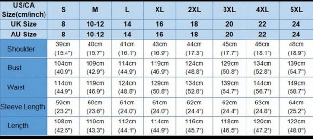 - Large: Shoulder - 16.1 inches, Bust - 44.9 inches, Waist - 48.8 inches, Sleeve - 24 inches, Length - 44.1 inches